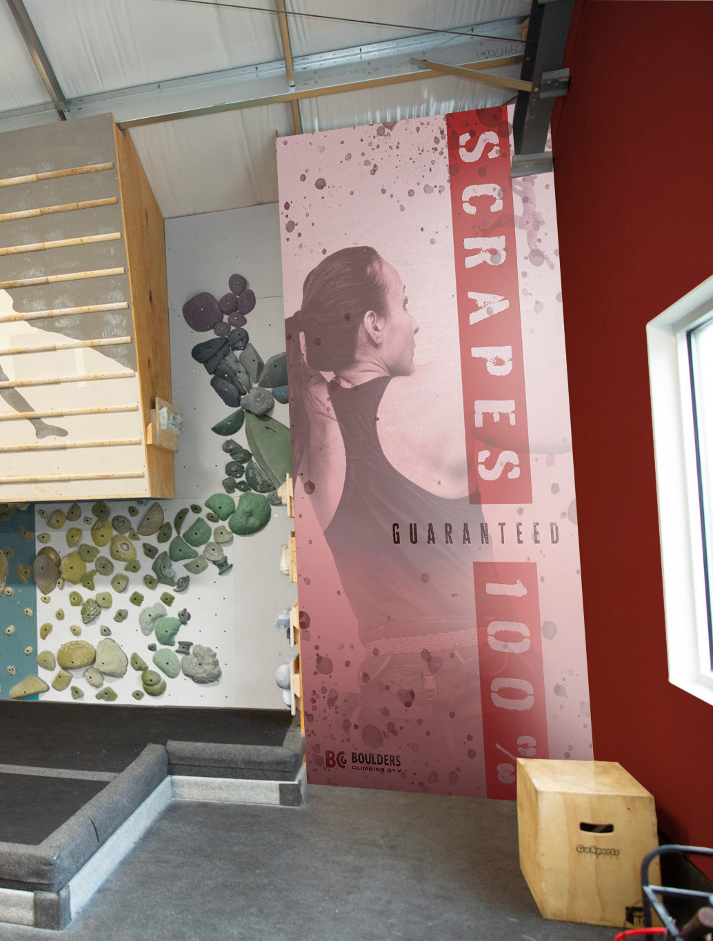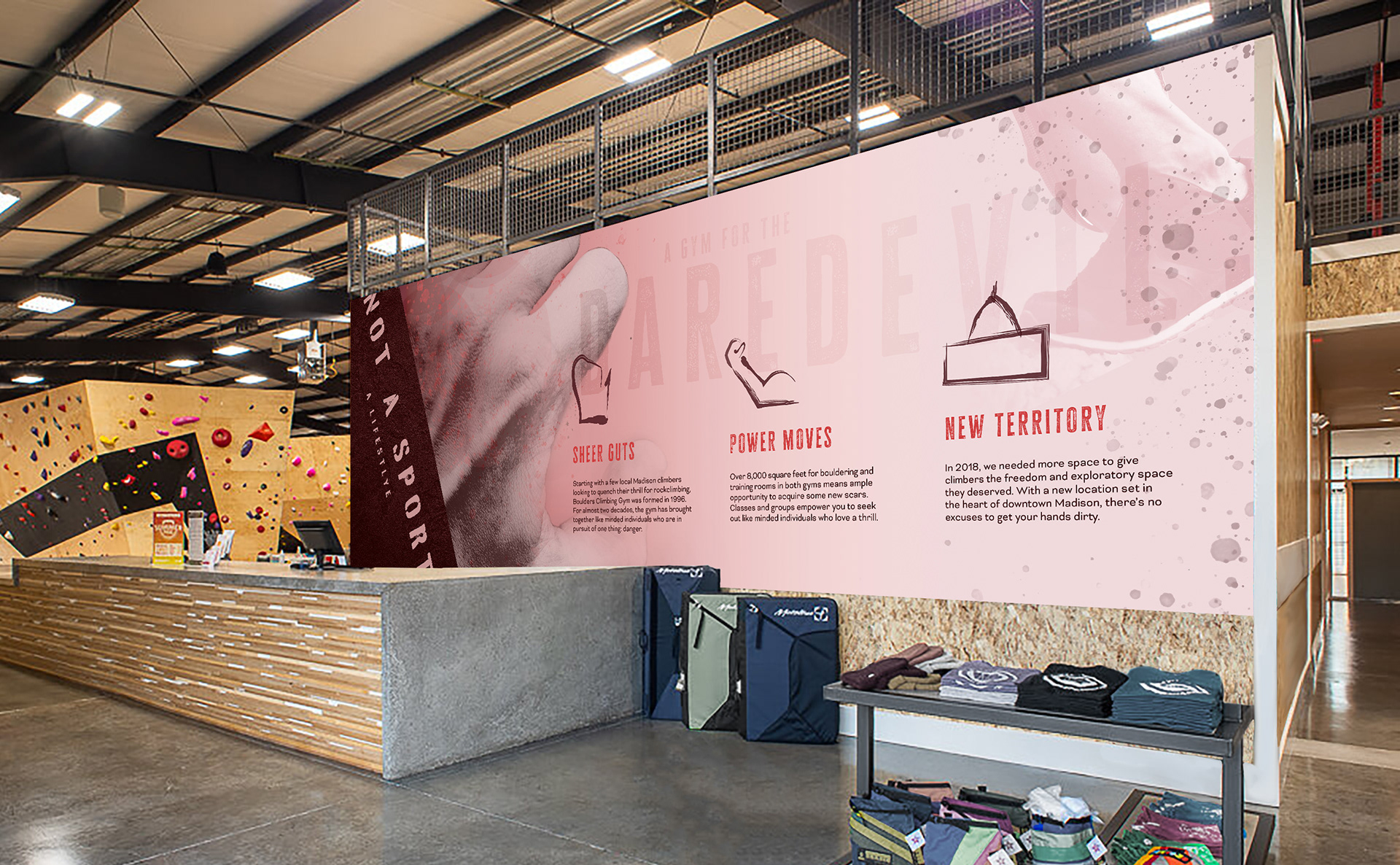 Textural elements that were incorporated into the new branding that felt dirty and rough helped to convey how Boulder's Climbing Gym wants their climbers to not be afraid to experiment and take risks to better their skillset. This was achieved with both the weathered, imperfect typography and dot splatter overlay used throughout the brand components.